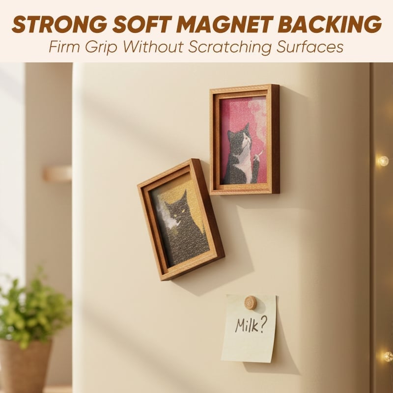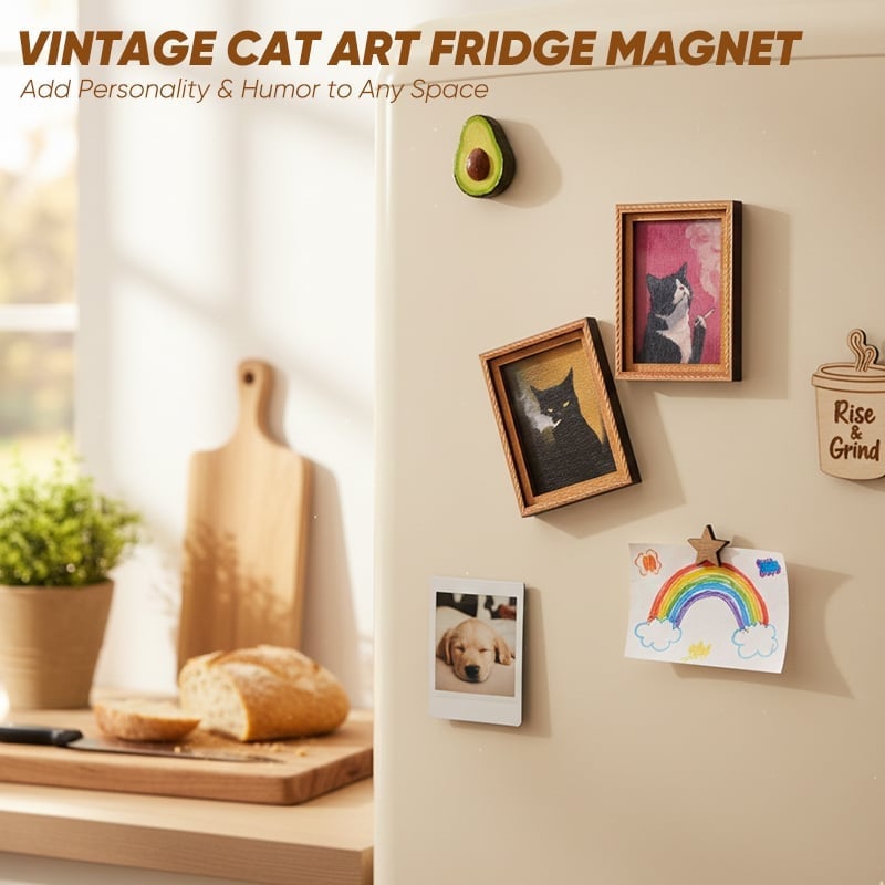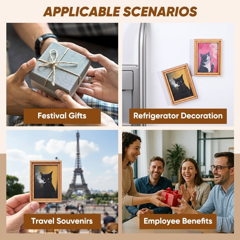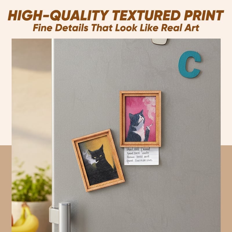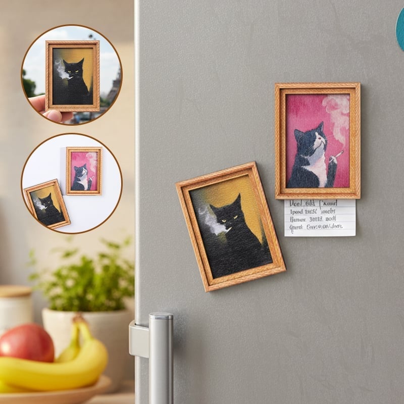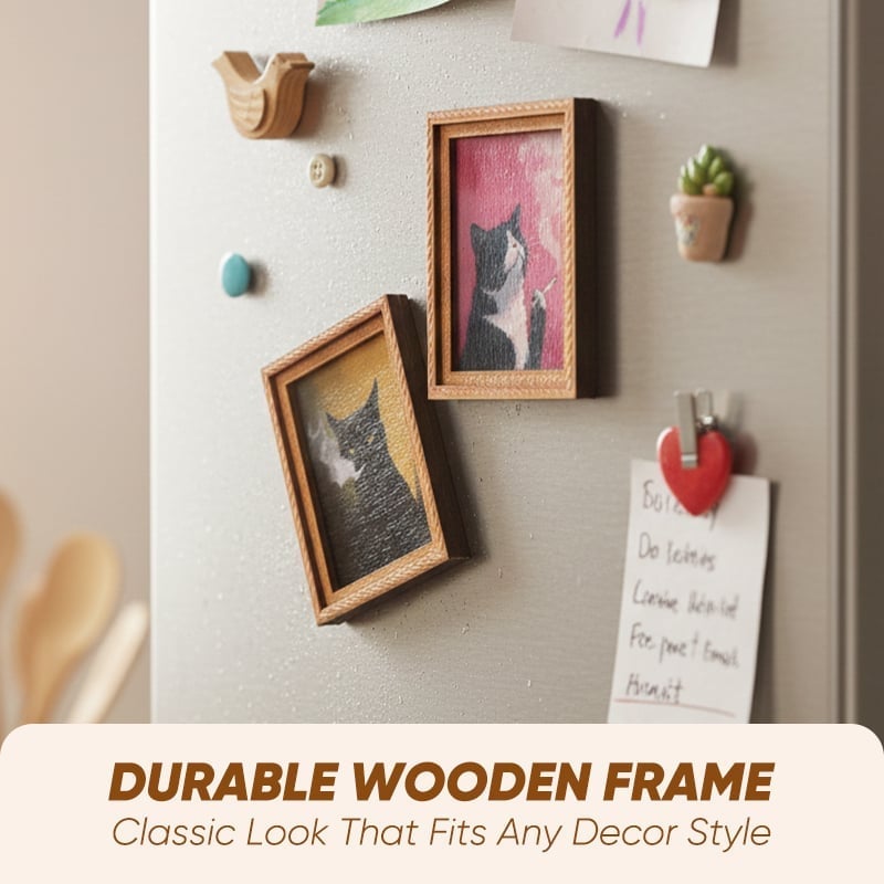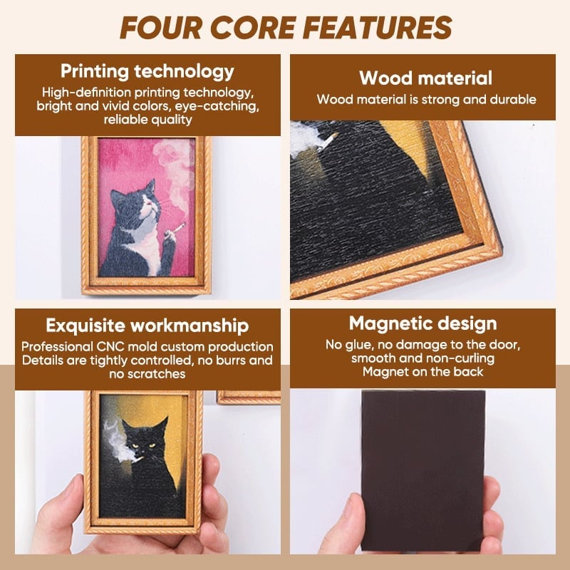 🌟 Verspielte Katzendarstellungen: Jeder Magnet zeigt ein einzigartiges, handbemaltes Holzrahmenmotiv mit niedlichen Katzenthemen, das jeder magnetischen Oberfläche verspielte Eleganz verleiht.